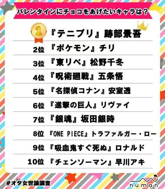 上一次情人節,日推也按照“有事鞠躬無事票選”的慣例開始了一輪“情人節最想給TA巧克力的角色TOP10”的投票。在日本,情人節有着女生向心儀男子送巧克力的習慣,所以果不其然,辛俐也擠進了前三名,勇奪榜眼。