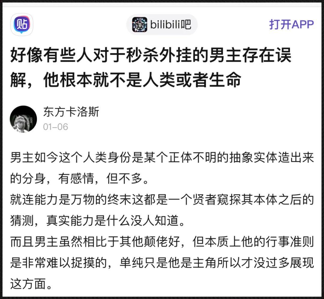 什麼意思呢?就是你以爲他是有秒殺外掛,實際上他的人類身份是類似克蘇魯那樣的某個古神分身。純粹屬於套皮下凡,過日子玩玩看的。