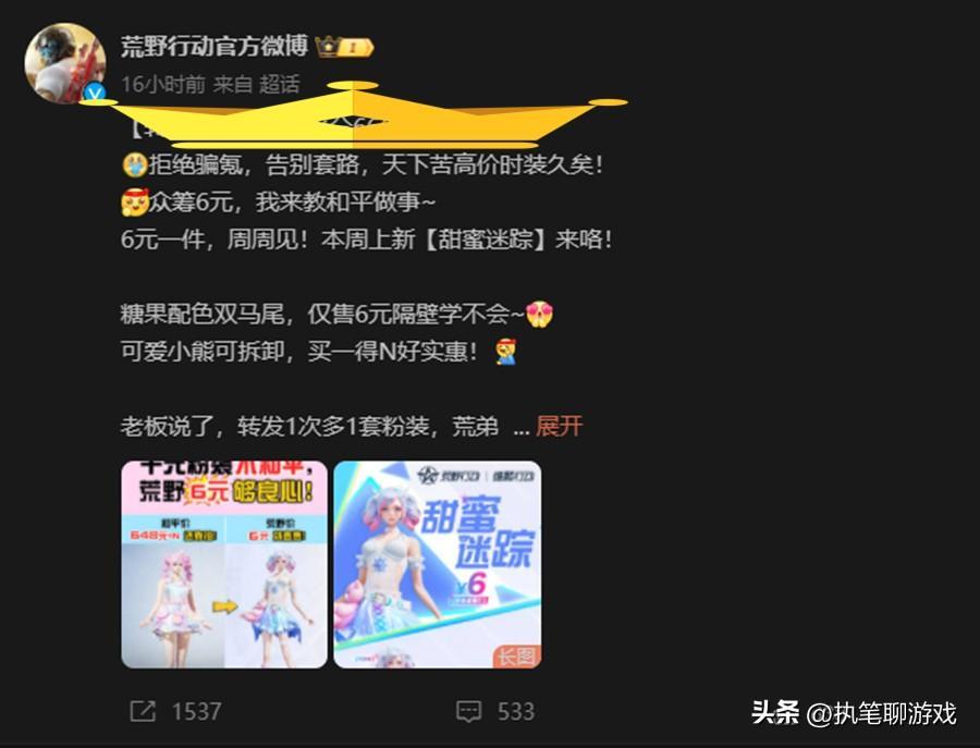 同樣以此次荒野帶來的“甜蜜迷蹤”爲例,如果不是爲了“開撕”的話,會有如此良心的“6元直售”嗎?作爲荒野的玩家,起碼得到了想要的結果。