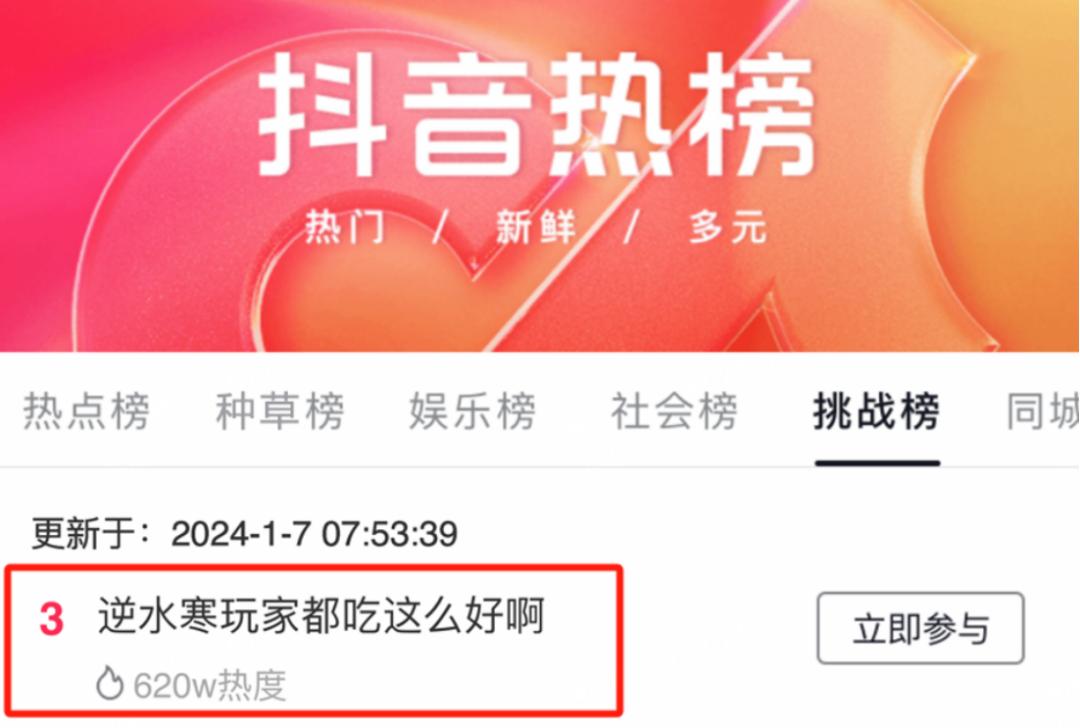總之,養眼的美女帥哥COS、驚喜不斷的整活、豐厚的禮包和福利,讓餘下沒到場的4000多萬玩家狠狠羨慕了,酸溜溜的話題「逆水寒玩家都喫這麼好啊」也快速衝上了抖音挑戰榜TOP 3。