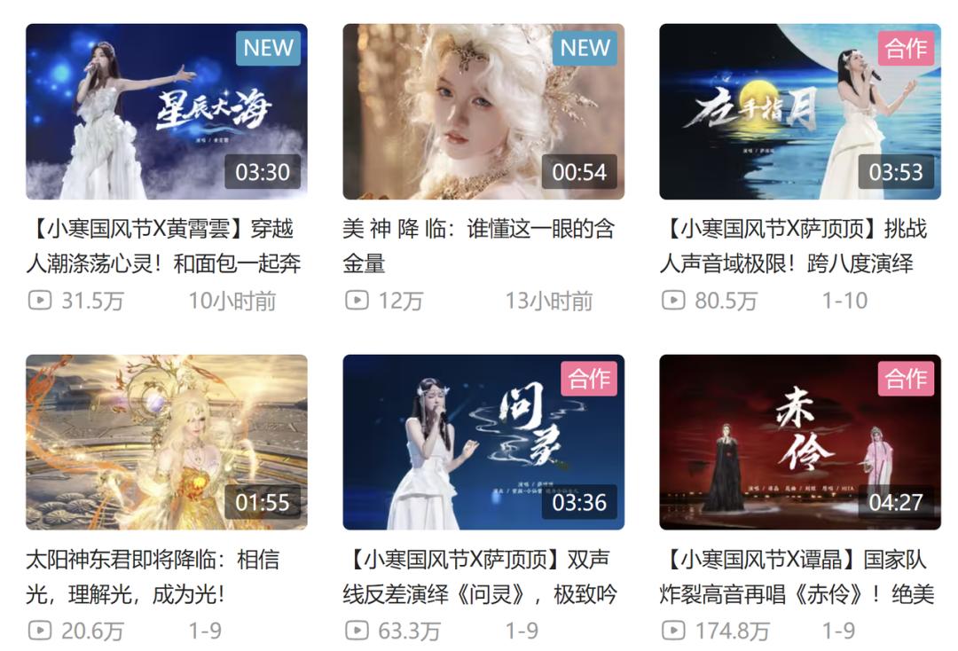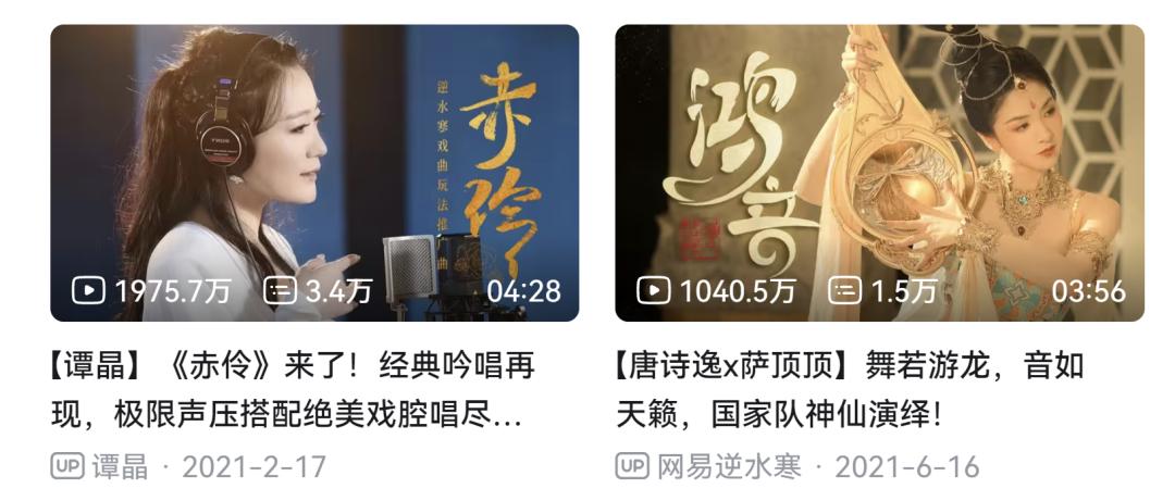 翻看逆水寒在各平臺的視頻內容,你會發現由譚晶演唱的《赤伶》,是他們在B站最火的視頻,播放量接近2000萬;薩頂頂爲逆水寒創作的新職業主題曲《鴻音》,也在B站拿下了超1000萬的播放量。