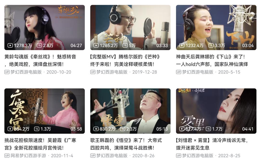 更有意思的是,跟逆水寒一樣,網易《夢幻西遊》端手遊也特喜歡邀請國家隊歌手演唱古風曲目,並且不止一次地因此出圈,在B站等平臺引發了翻唱和傳播熱潮。