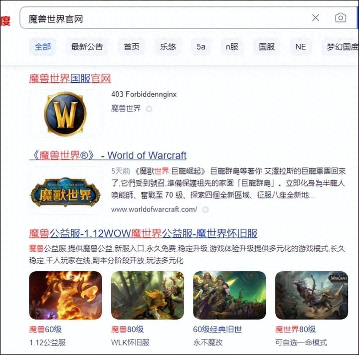 第二個結果是魔獸世界的亞服官網,而第三個搜索出來的結果依舊是公益服。