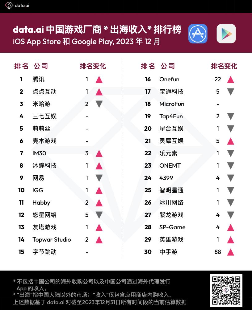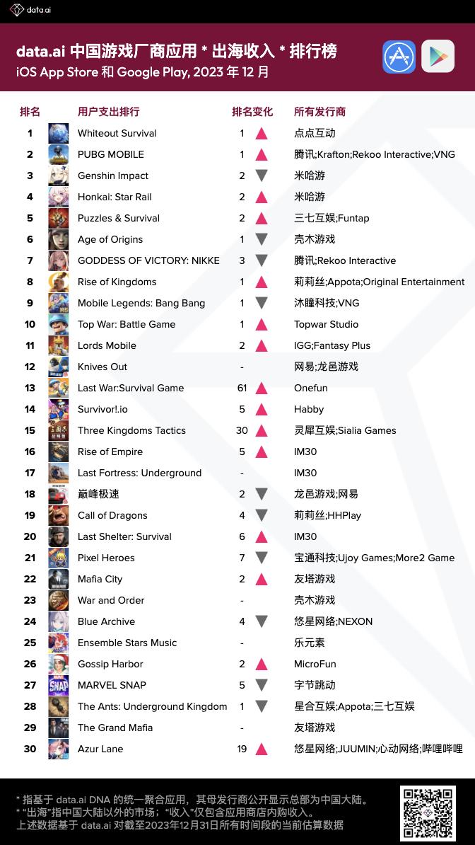 1月16日,data.ai公佈了12月中國遊戲出海收入榜。
