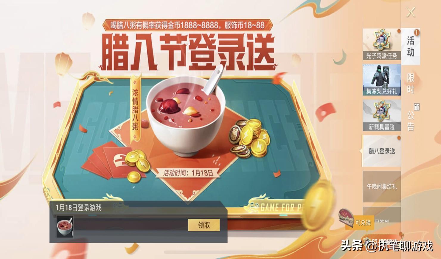 最後提醒大家別忘了喝臘八粥哦,光子送來的就算了,打開之後全是金幣,這獎勵什麼時候才能給良心升級下呢?嘿,沒辦法,《和平精英》的福利獎勵實在是讓老玩家們一言難盡。