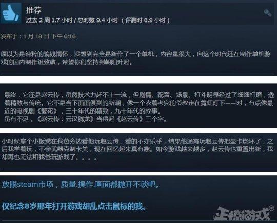 不過也有玩家評論說,原本以爲會是情懷詐騙,沒想到內容充足,向還在堅持單機的製作組致敬。還有老玩家表示,雖然遊戲處處都透露着貧窮,但是遊戲的劇情,配音,動作等都有精心的打磨過,因此遊戲雖有不足,但是對得起“趙雲傳”三個字。