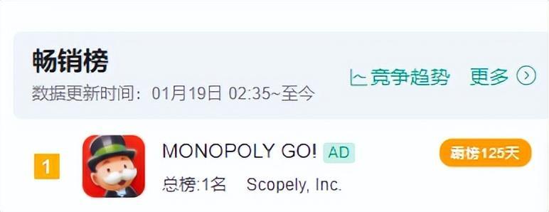 12月的第一名是同樣長期霸佔排行榜的《MONOPOLY GO!》!2023年12月Scopely《Monopoly GO!》在全球 App Store 和 Google Play 吸金2.19億美元,首次成爲全球手遊暢銷榜冠軍。