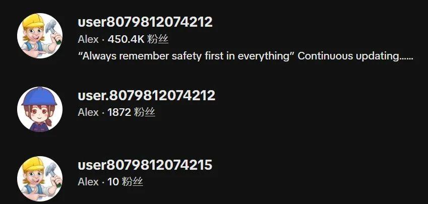 現在,蜻蜓動畫已經成了海外視頻搬運工薅羊毛的寶地。在TikTok、油管和X上,許多賬號就以搬運其視頻爲生,他們用相似的頭像,名字要麼是一串默認數字,要麼直接就叫“安全教育頻道”。