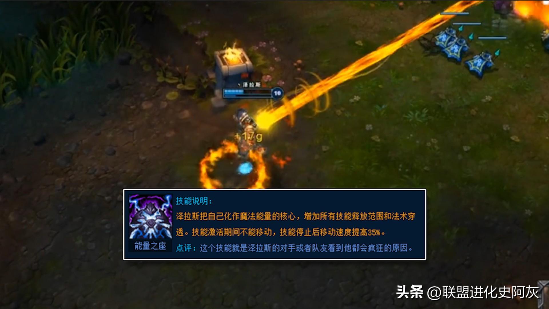 傷害技能講完,最後說W能量之座,這個技能是老澤拉斯的機制與特色核心,打開蓋子(需要引導),坐上馬桶(無法移動),增幅其他技能的射程,並附帶最多40%法穿,提上褲子後還會獲得移速,WQ比現在蓄滿Q還遠,經典秒人連招(WERQRR)更是防不勝防,法穿棒一出,即便你是坦克也挨不住三炮,那會澤拉斯最讓人印象深刻的,就是打團前跑犄角旮旯一蹲,然後隊友四下排開保他輸出,確實很有狙擊手內味。