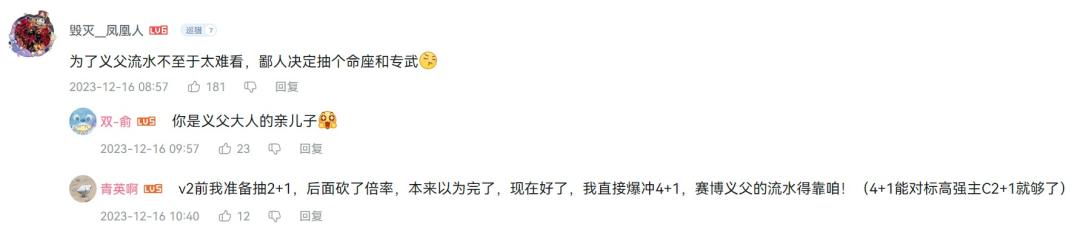 這裏面的成因可能有很多。比如一些玩家表示,它都已經送角色了,那我是不是也得抽個命座和專武?甚至還有一些朋友表示,「它這樣送得我都不好意思了,不表達一下支持,實在說不過去。」
