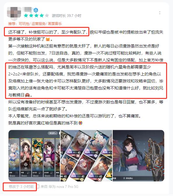 回過頭來看看,若是白荊在剛上線的版本中,一方面適當調整卡池,替換成昊蒼/雲無月/龍晴之類更具泛用性或當前版本更保值的角色進行UP;另一方面,考慮到遊戲本身在很多內容上已經存在刻印(即已經構築好的體系)評級或等級的限制,是不是可以適當放開主線劇情進度,比如開放前三章,讓玩家可以自然遇到卡關難點,風評會不會好一些?
