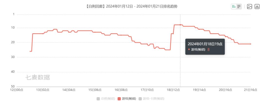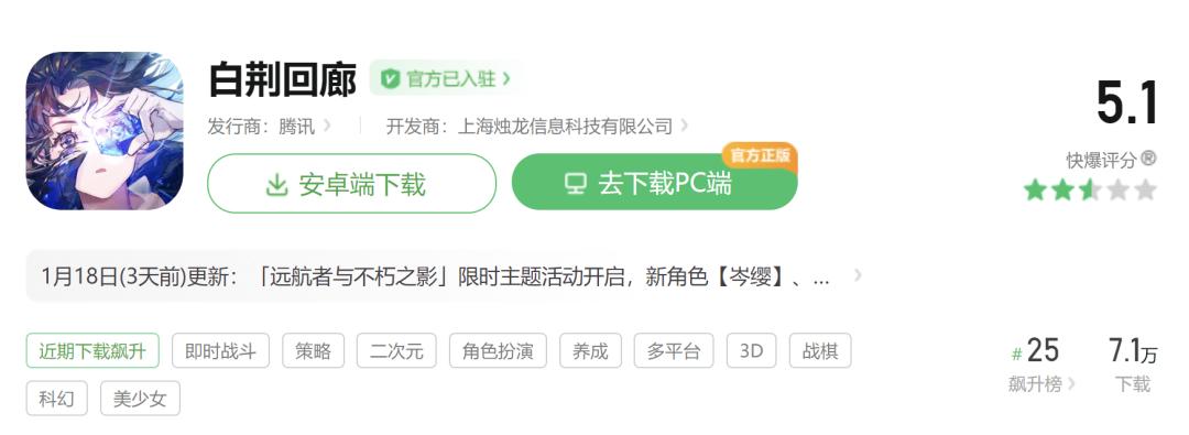 一時間,不少人都看起了笑話:高舉高打的發行策略,是不是不匹配白荊的產品定位?號稱是被老闆們寄予厚望的二次元準爆款,難道就這?這回“騰子”是不是翻車了?然而峯迴路轉,白荊的暢銷榜曲線非但沒有急轉直下,反而在1月18日更新新卡池後,直接竄升至Top 8的高位。它的TapTap評分,也一點點回升到了6.0分。