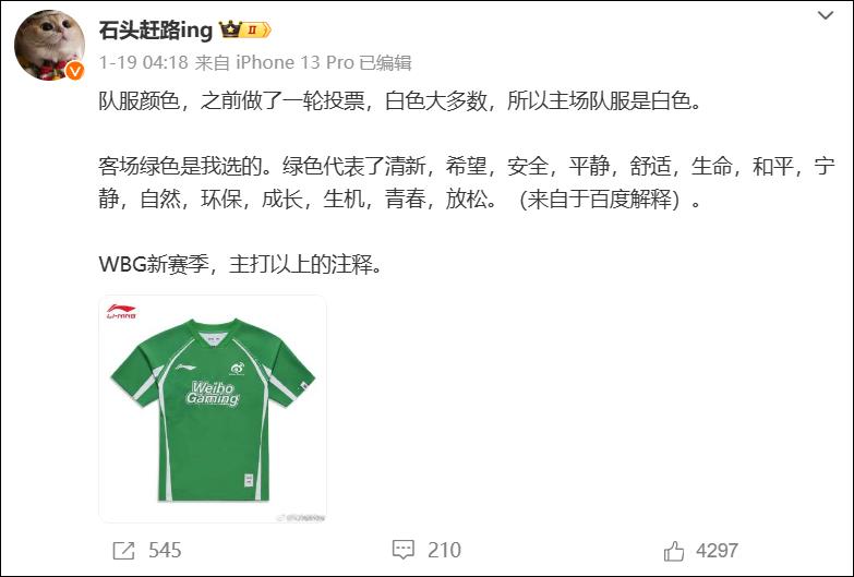 除了難分清的經典紅白配色,WBG還有一套主題色爲“綠色”的客場隊服。WBG老闆「石頭趕路ing」在這套隊服公佈之初就發了一篇微博作以調侃。