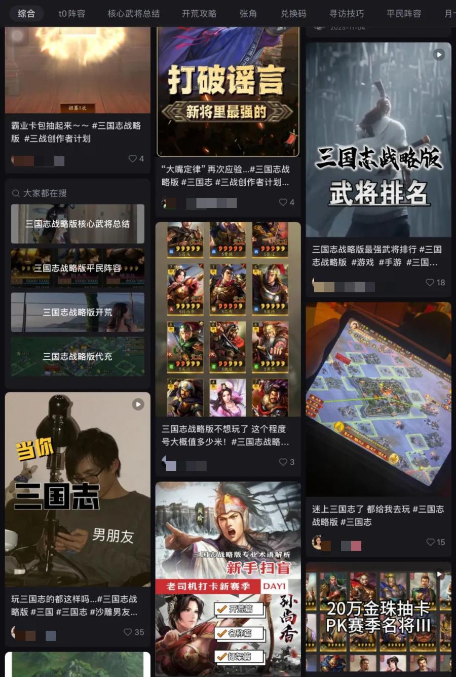 像一些我們印象中女性不太會碰的品類,在小紅書也有很全面的內容。比如《率土之濱》《三國志戰略版》這樣的SLG、《火影忍者》這樣的格鬥遊戲等等。事實上,SLG和體育格鬥兩條賽道,在小紅書男性遊戲用戶搜索比例上分別排到了前兩位。