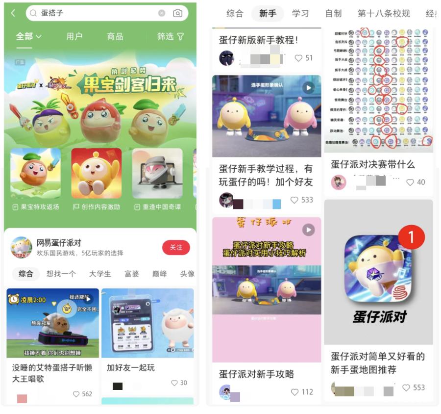 以《蛋仔派對》爲例,它的蛋搭子文化就不是一夜爆火的成果,而是一項長期的破圈工程。這款全民向休閒遊戲,要實現的破圈路徑是休閒/派對賽道玩家→女性玩家→泛玩家,所以在初期,遊戲先從最核心的玩法攻略、皮膚獲取入手,通過官號內容和少量頭部遊戲KOL,吸引那些對《蛋仔派對》有明確興趣的核心玩家。