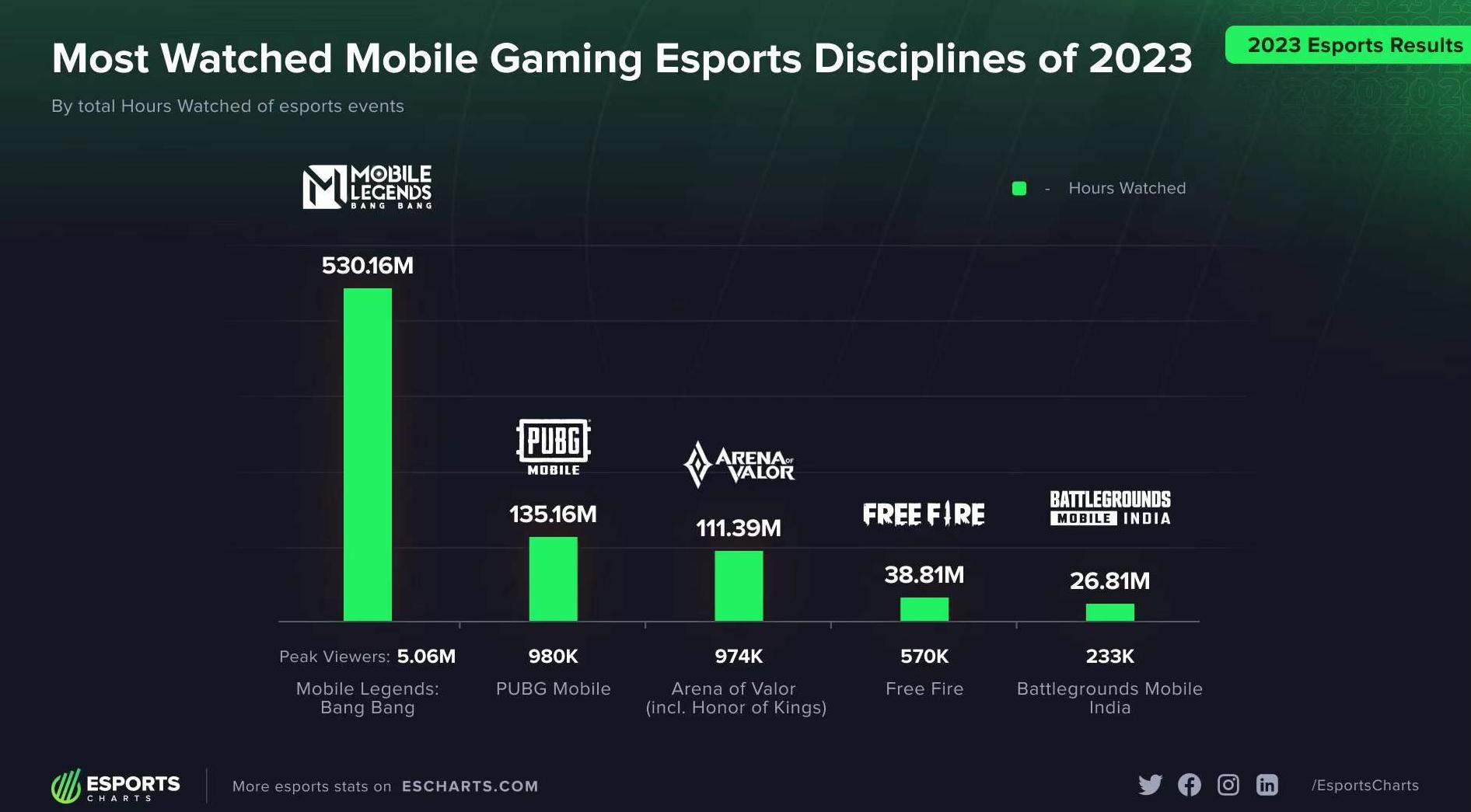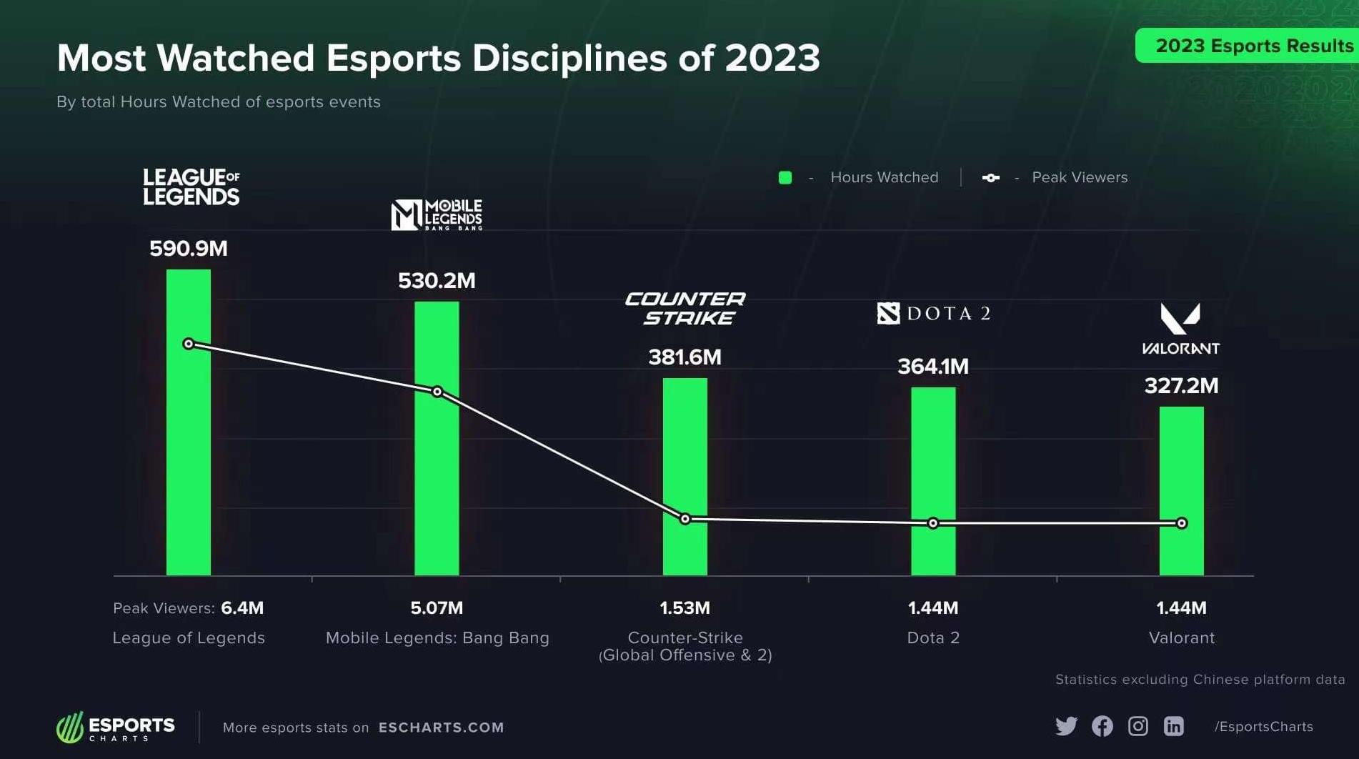 據第三方權威數據網站Esports Charts統計,在2023年全球電競賽事熱度榜單中,決勝巔峯位居全球電競賽事第2。M5世界總決賽以506萬的峯值觀賽人數,成爲2023年度全球移動電競賽事第1。