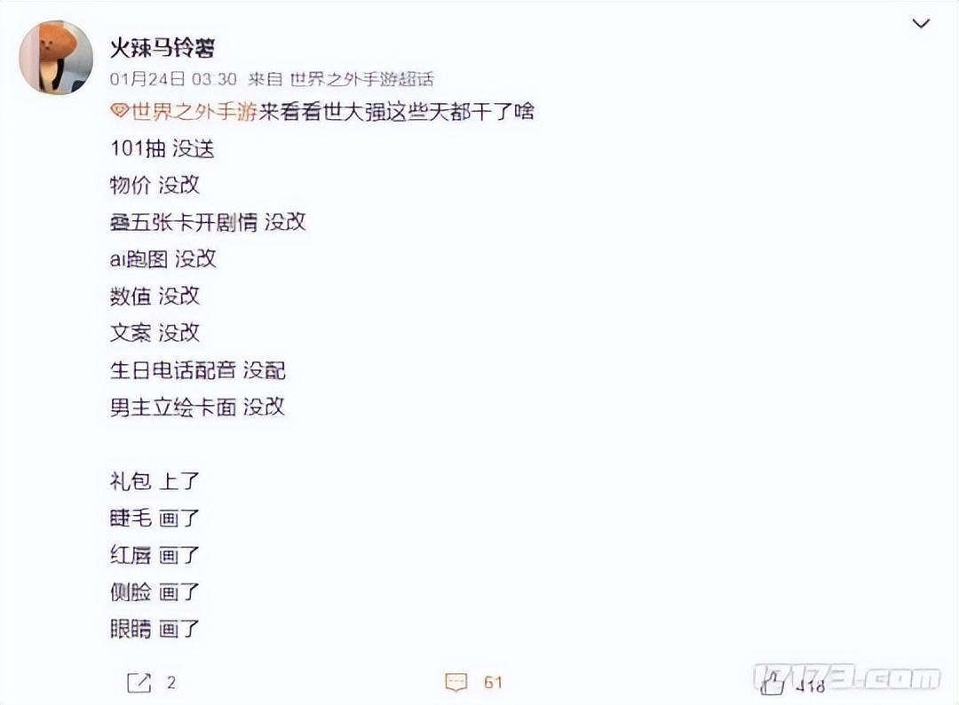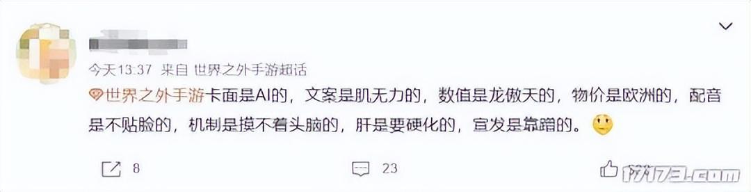 有玩家就總結到:卡面是AI的,文案是肌無力的,數值是龍傲天的,物價是歐洲的,配音是不貼臉的,機制是摸不着頭腦的,肝是要硬化的,宣發是靠蹭的。