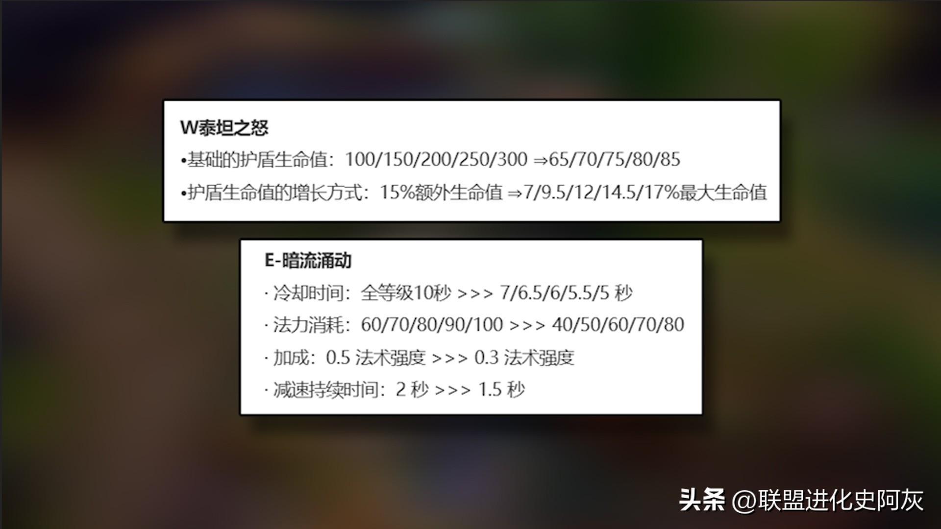這下水道一呆就是兩年,期間設計師給了泰坦,很多數值補償,着重說一下這兩次,W護盾從額外生命值加成改爲最大生命值,中後期更肉了,E技能CD大幅降低,線上換血和刷野能力都有了巨大提升,5.5版本兩大坦克神器的出現徹底改變了峽谷生態,野區全是肉gay互搏,泰坦又能疏通航道了,而上單冰火流(日炎冰拳/心)也在此刻正式崛起。