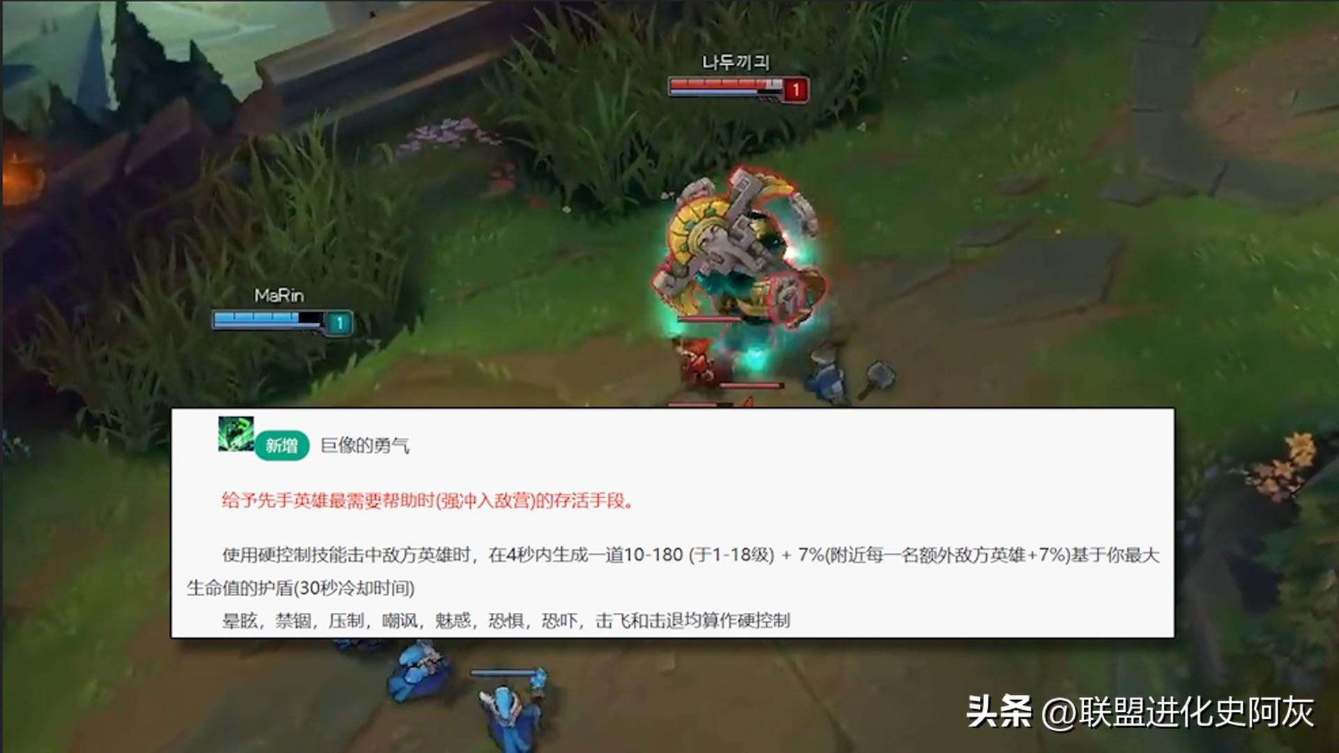 但是!這還不是最強的時候,上單泰坦的終極形態其實是在S7賽季初,當時防禦繫上了一個新天賦,叫作“巨像的勇氣”,你可以把它理解爲出門自帶末日寒冬,泰坦平A就能觸發,盾沒了再開W,相當於前期每30秒就有一個兩三百的盾,持續時間還很長,你說這換血誰能換的過你?最經典的就是打團兩邊倒了八個人,剩倆上單在那互掐,然後發現誰也打不死誰,最後和平分手。只可惜沒過多久,巨像就倒了,而泰坦也遭到了又一輪爆削,隨着S8征服者和偷錢的到來,他的上單美夢也就此破碎。