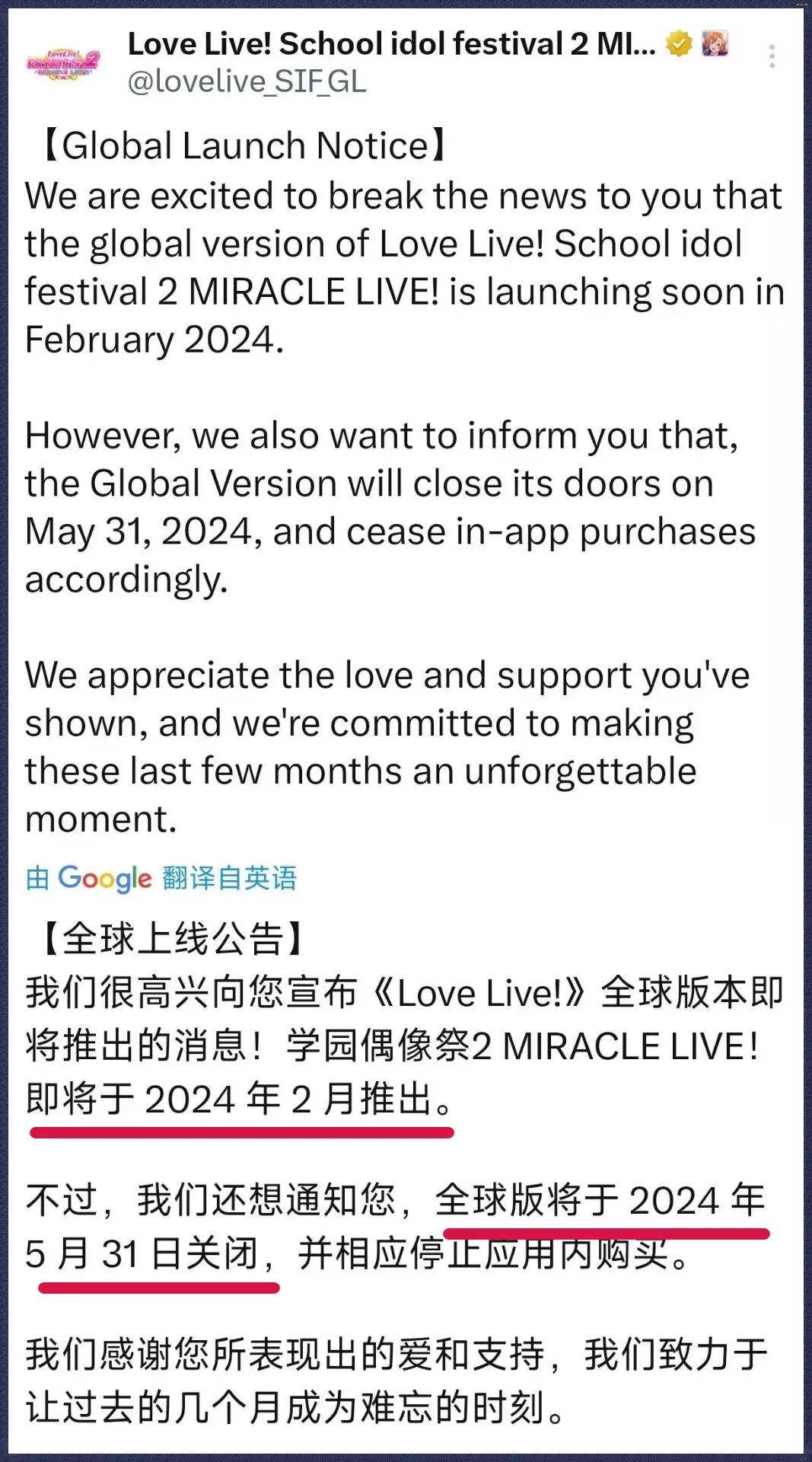 SIF2的國際服跟着宣佈將在2024年2月開服,5月31關服。遊戲還沒出生就宣佈死期,這是騙不關注新聞的海外粉絲麼……