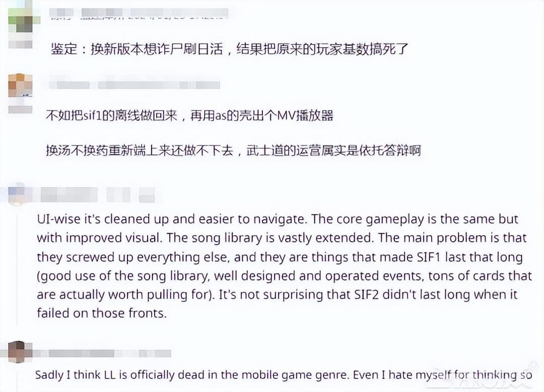 有國外網友評論說,雖然二代在UI設計和視聽效果上比一代提高了很多,曲庫也大大滴增加了,但是運營真不行,把一切都搞砸了。有悲觀網友感慨,雖然我自己都沒法接受這個現實,但是不得不說《學園偶像祭》的時代結束了。