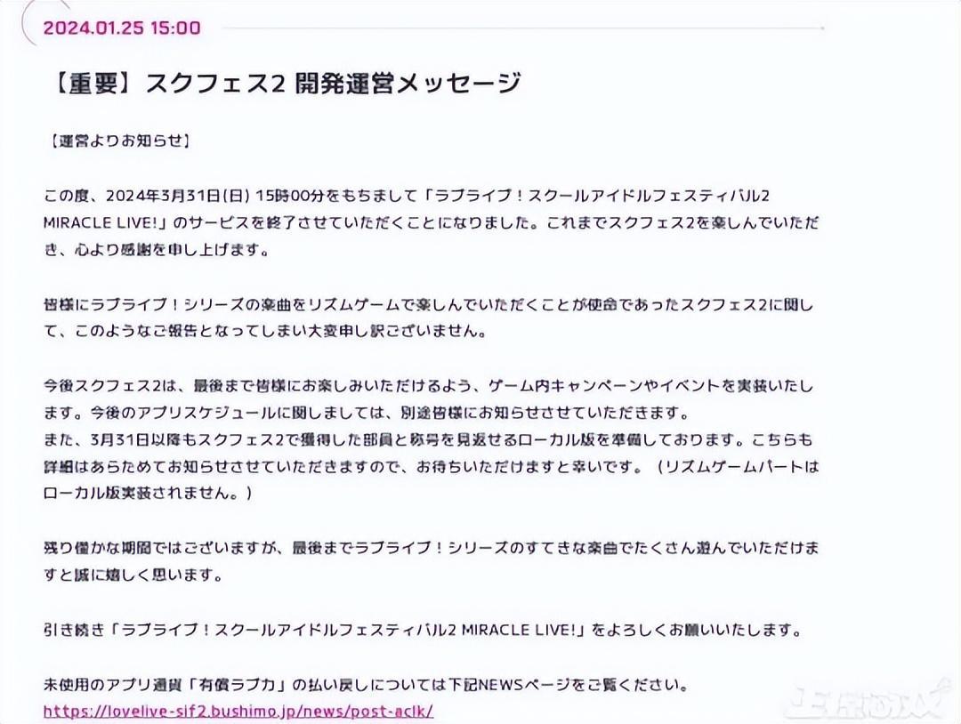 由日本Bushiroad開發運營的養成音遊《Love Live!學園偶像祭2 MIRACLE LIVE!》(後文簡稱《學園偶像祭2》)宣佈,遊戲將於2024年3月31日停止運營,停運後官方會更新離線版,這個離線版雖然不帶音遊部分,但是讓可以欣賞部員,查看稱號數據等內容。