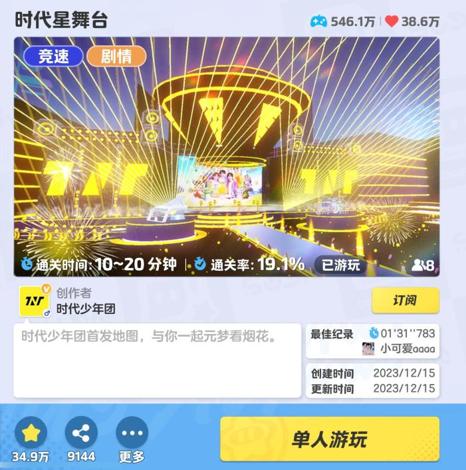 時代少年團的代言也帶動了遊戲的熱度,《元夢之星》裏的時團主題UGC地圖“時代星舞臺”累計遊玩量已經超過了500萬,地圖對舞臺裝置、華麗特效的還原引得不少路人也去觀摩打卡,也啓發了其他明星粉絲在《元夢之星》裏製作應援地圖。