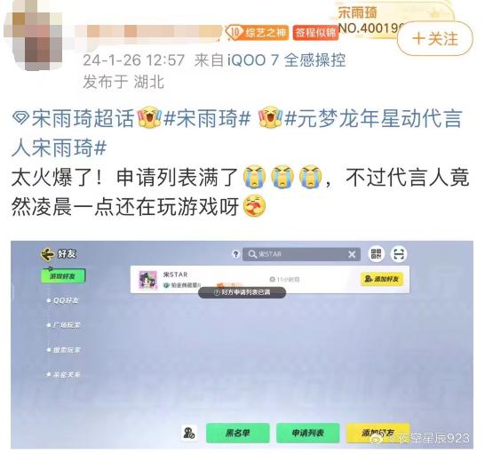 腦筋轉得快的當然是馬上申請好友位,結果宋雨琦的粉絲髮現她凌晨1點還在線,無縫轉匹配“逮捕”。有些人甚至是第一次玩手遊,還順勢在超話裏分享心得。