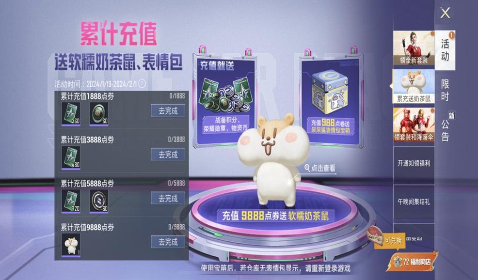 然後則是累充獎勵的“奶茶鼠”,同樣進入倒計時階段,接下來的春節期間必然還會出現一系列新軍需以及經典返場,如果有想法挑戰抽獎,此時出手還不算晚。不過此需要提醒大家,切莫被一些有心之人用所謂的“幫充”給忽悠了,到最後得不償失。
