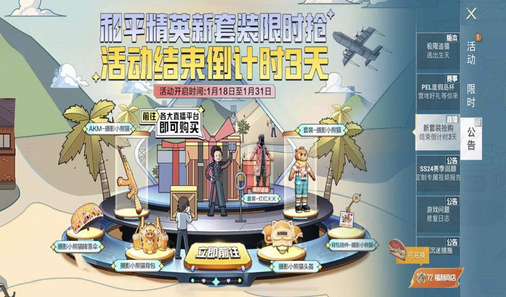 首先是遊戲外的點券直售,攝影小熊貓系列以及返場歸來的紅紅火火,進入最後3天。不過考慮到此類點券直售的遊戲規律,未來必然也會出現返場,甚至可能出現在“精英手冊”裏,所以即便是錯過的話,也可以等待下一次返場。