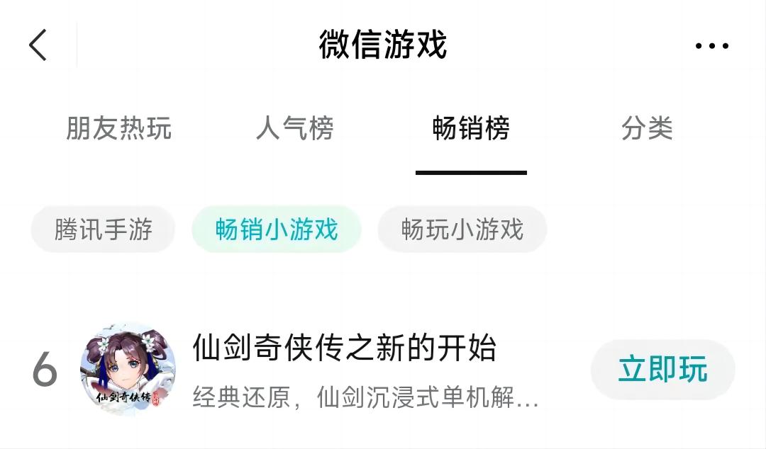 1月23日微信小遊戲暢銷榜上線近半年,《新的開始》還在暢銷第6位