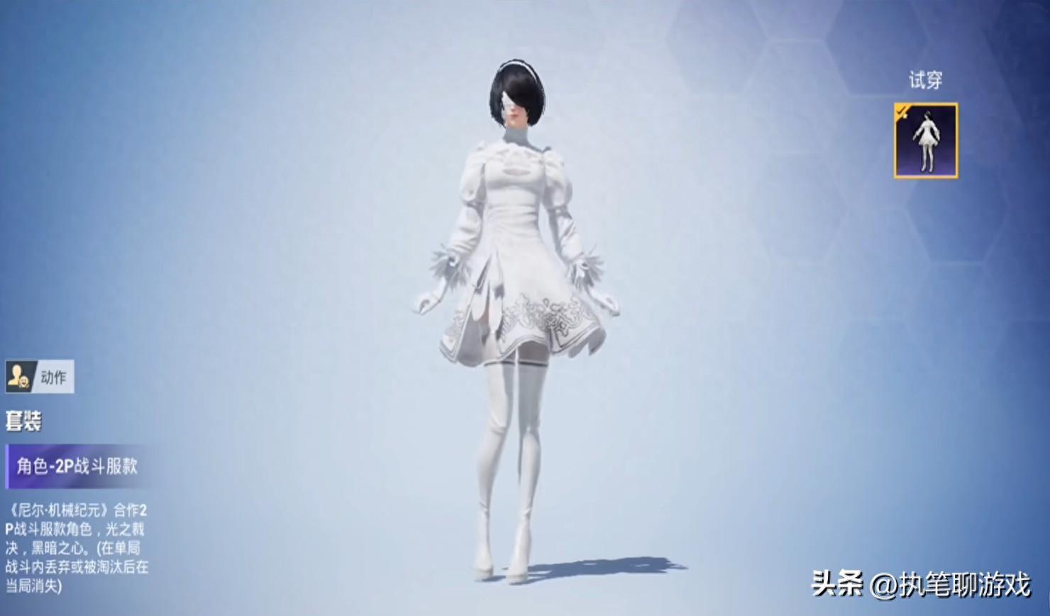 如圖所示,我們首先看到的是“一黑一白”中的白色,被命名爲“2P戰鬥服款”,光子稱其爲“尼爾·機械紀元”合作2P戰鬥服款角色,光之裁決,黑暗之心。