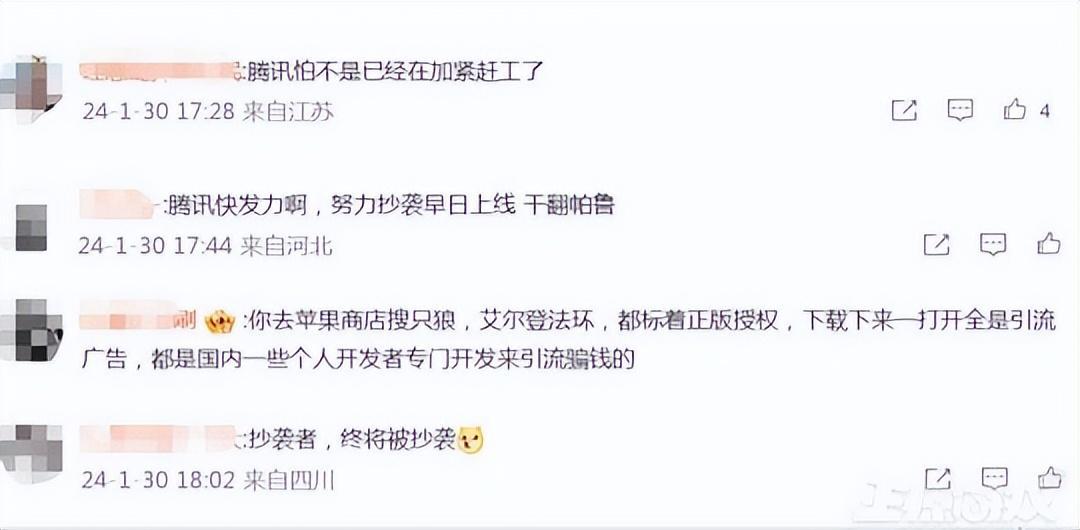 有網友對此吐槽,騰訊怕不是依舊在加緊趕工了。還有支持騰訊的網友表示,騰訊快發力,努力抄襲早日上線幹翻帕魯。也有熟悉山寨廠商套路的網友評論說,這些山寨遊戲都是引流的廣告,這是國內有一些個人開發者引流騙錢的招數。