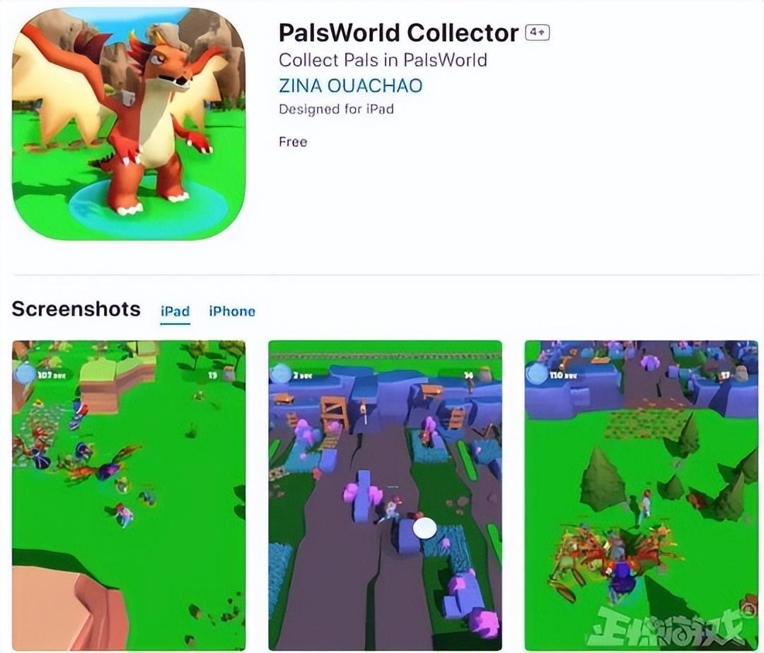 這並不是App store上第一款山寨《幻獸帕魯》的手遊,前幾天就有山寨版被曝光過,那是一款名爲《PalsWorld Collector》的遊戲,名字裏的“PalsWorld”相比《Palworld》多了一個“S”,最後還加入了“Collector”,遊戲的圖標和展示圖片風格和《幻獸帕魯》相似,但並沒有直接盜用《幻獸帕魯》的素材。