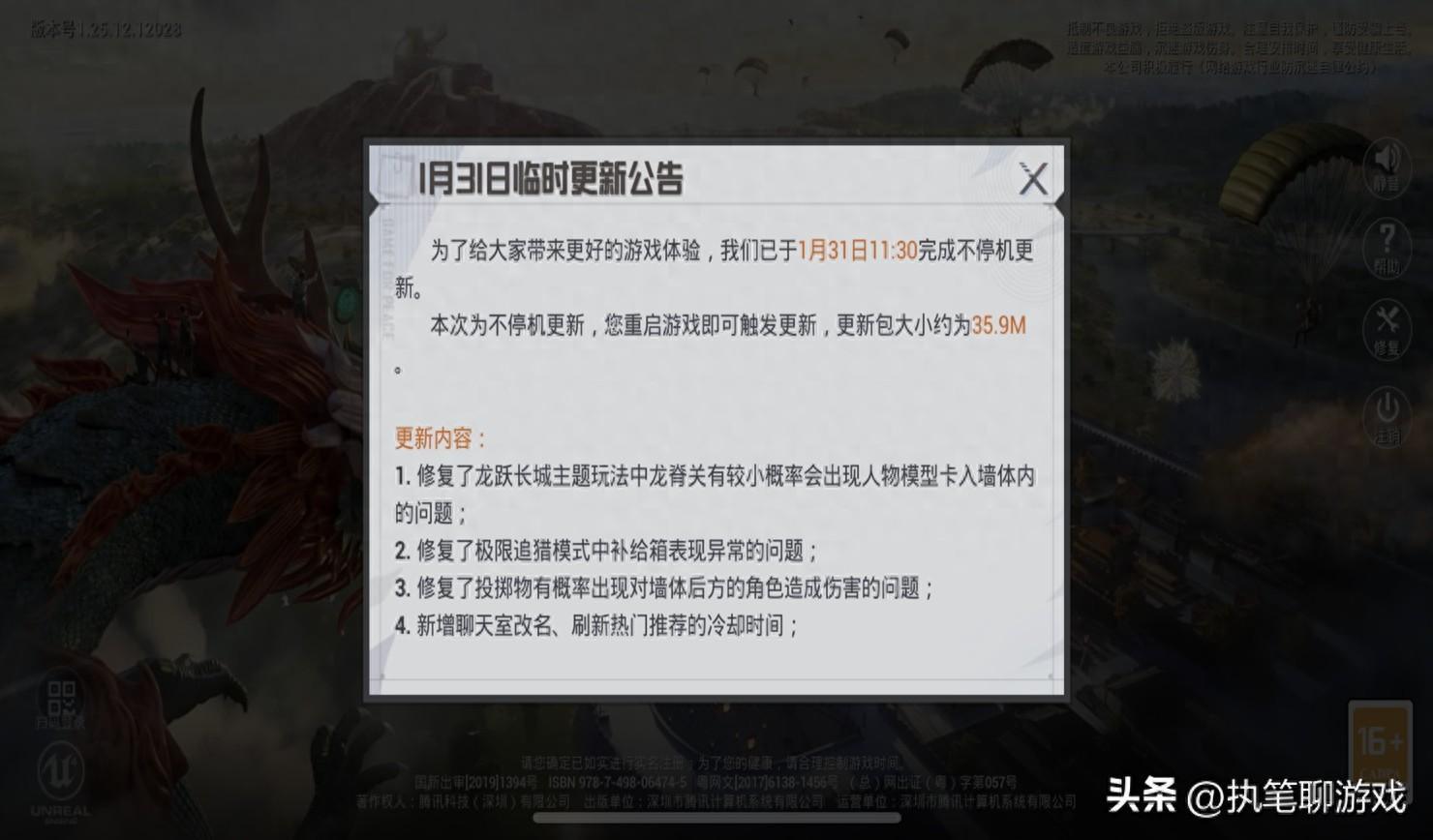 如圖所示,如今的《和平精英》迎來35.9M的小更新,光子官宣3個修復,它們分別是龍躍長城主題玩法中,龍脊關有較小概率出現人物模型卡入牆體內的問題;極限追獵模式中,補給箱表現異常問題;投擲物有概率出現對牆體後方的角色造成傷害的問題。