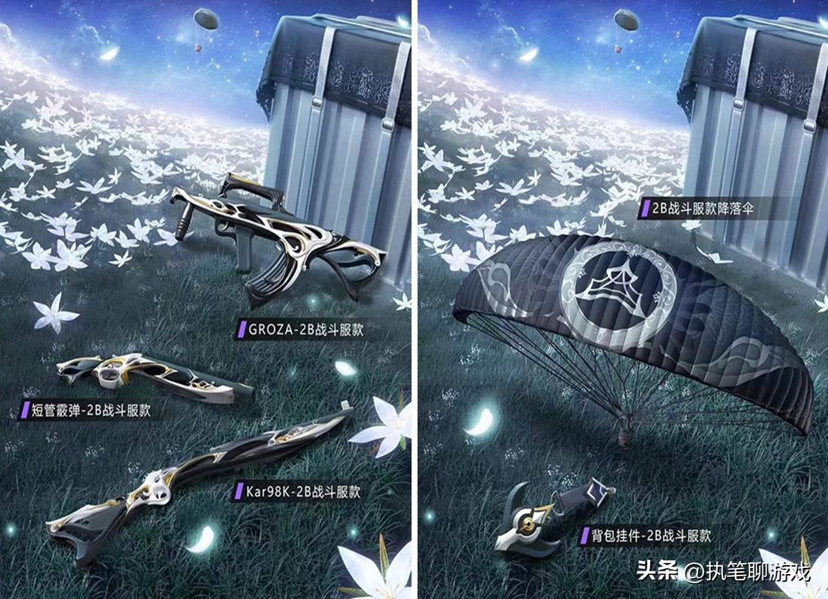 接下來登場的是2B戰鬥服款系列,其中的降落傘與掛件也是來湊數的,3個槍皮分別是短管霰彈、Groza、98K。