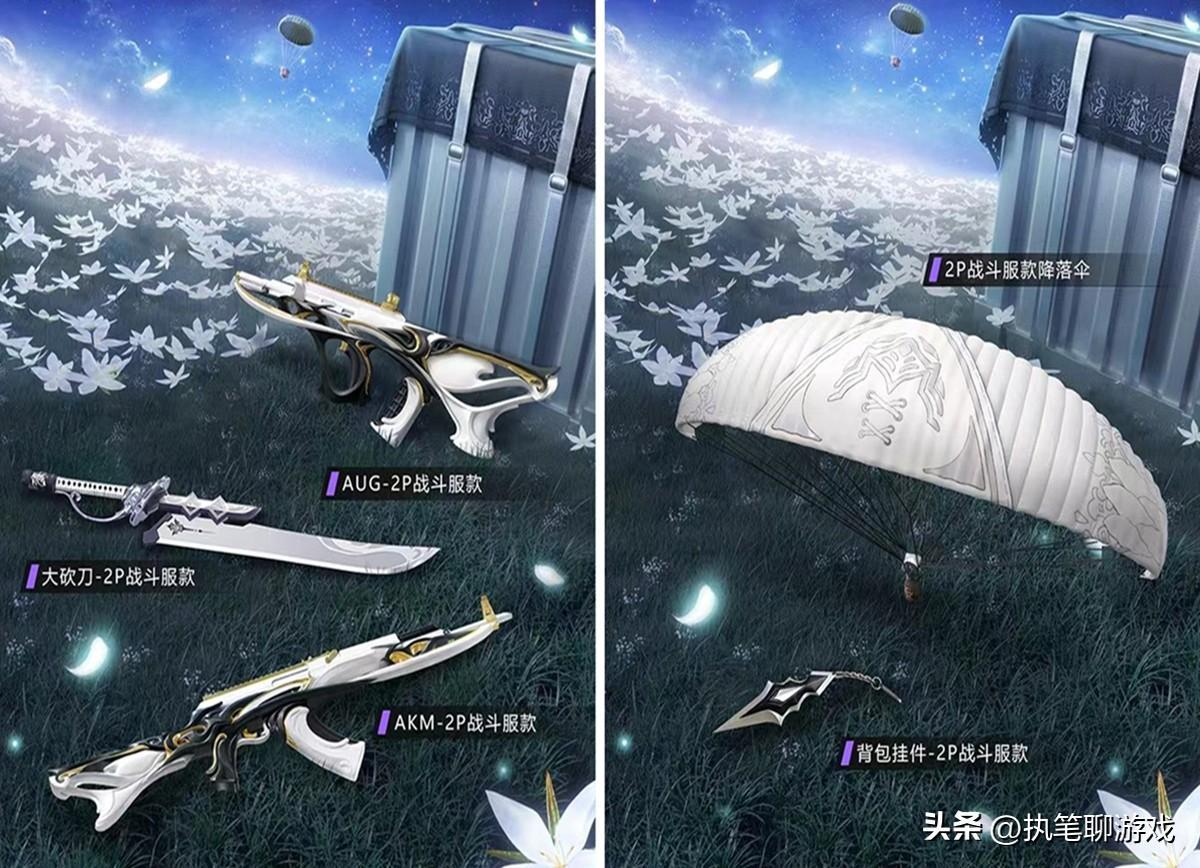 首先我們來看白色的2P戰鬥服款系列,其中的降落傘、掛件是用來湊數,3個槍皮分別是大砍刀、AUG、AKM,全部被光子重新建模,外觀可以說是相當炫酷。不過如果能夠3選1的話,天哥第一選擇自然是大砍刀。沒辦法,實在太帥了~