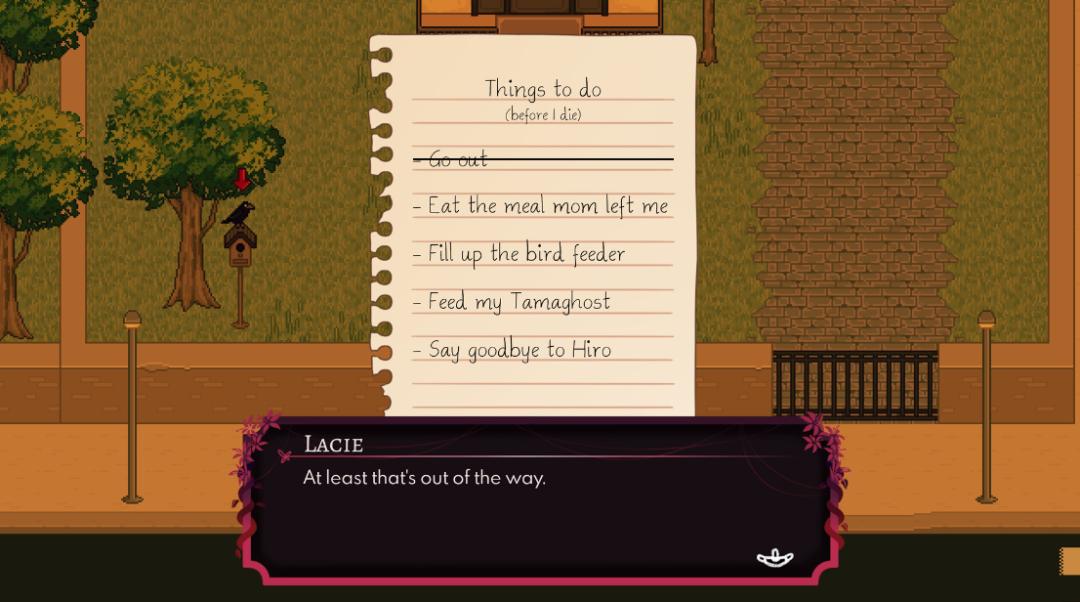 遊戲從一張散亂的便籤頁開始說起,這張便籤頁上記錄了“你”在死之前想要去做的幾件事,而“外出”這個選項剛剛被劃掉。