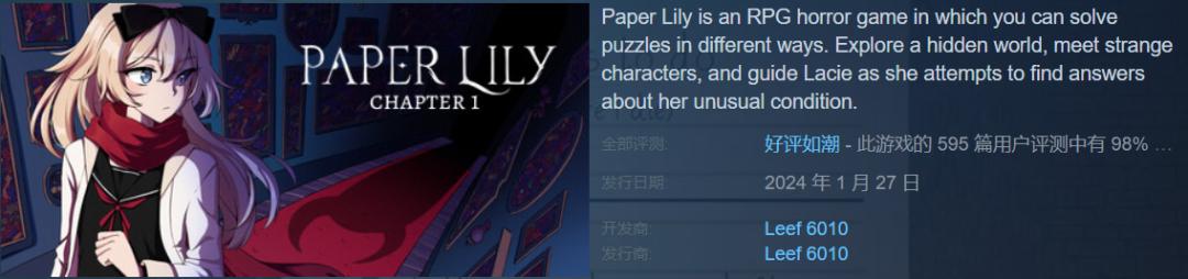 《Paper Lily》是1月27日,發佈在Steam上的一款免費像素風恐怖遊戲。在遊戲發佈的一週時間裏,它一共收穫了近600條評論,好評率高達98%。