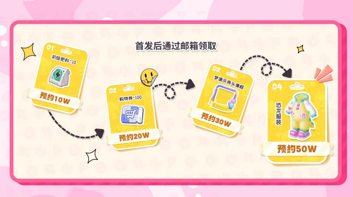 參與預約,即可領取福利,預約分別達到20萬、50萬、100萬、200萬,就可以領取到對應檔位的福利,包括初級肥料、購物券、夢境慶典頭像框,以及預約專屬服裝,陽光小恐龍外觀。