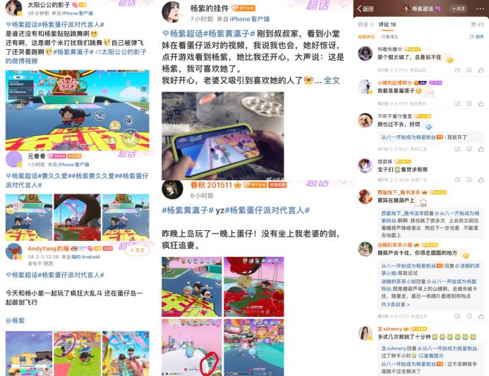 藝人微博超話也在近期出現了大量蛋仔遊玩內容,不少楊紫的粉絲表示,之前只是看身邊的小朋友玩,現在自己也進入遊戲體驗,還在評論區積極討論如何闖關,蛋仔儼然已經用門檻低、互動性強、福利多的活動形式結合藝人自身的熱劇女主屬性,在歲末年初之時觸達了新的玩家圈層。