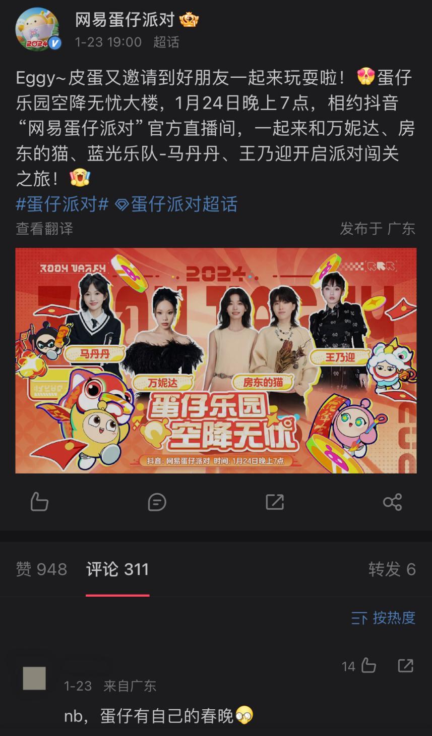 不僅如此,在1月24日,房東的貓、王乃迎、馬丹丹還聯合說唱歌手萬妮達,一同舉辦了一場2小時的直播。這場直播有4千萬人觀看,最高在線9萬,成爲了當日抖音直播休閒榜第一的直播活動,相關話題曝光量也超過了1.7億。怪不得有人直呼「nb,蛋仔有自己的春晚」。