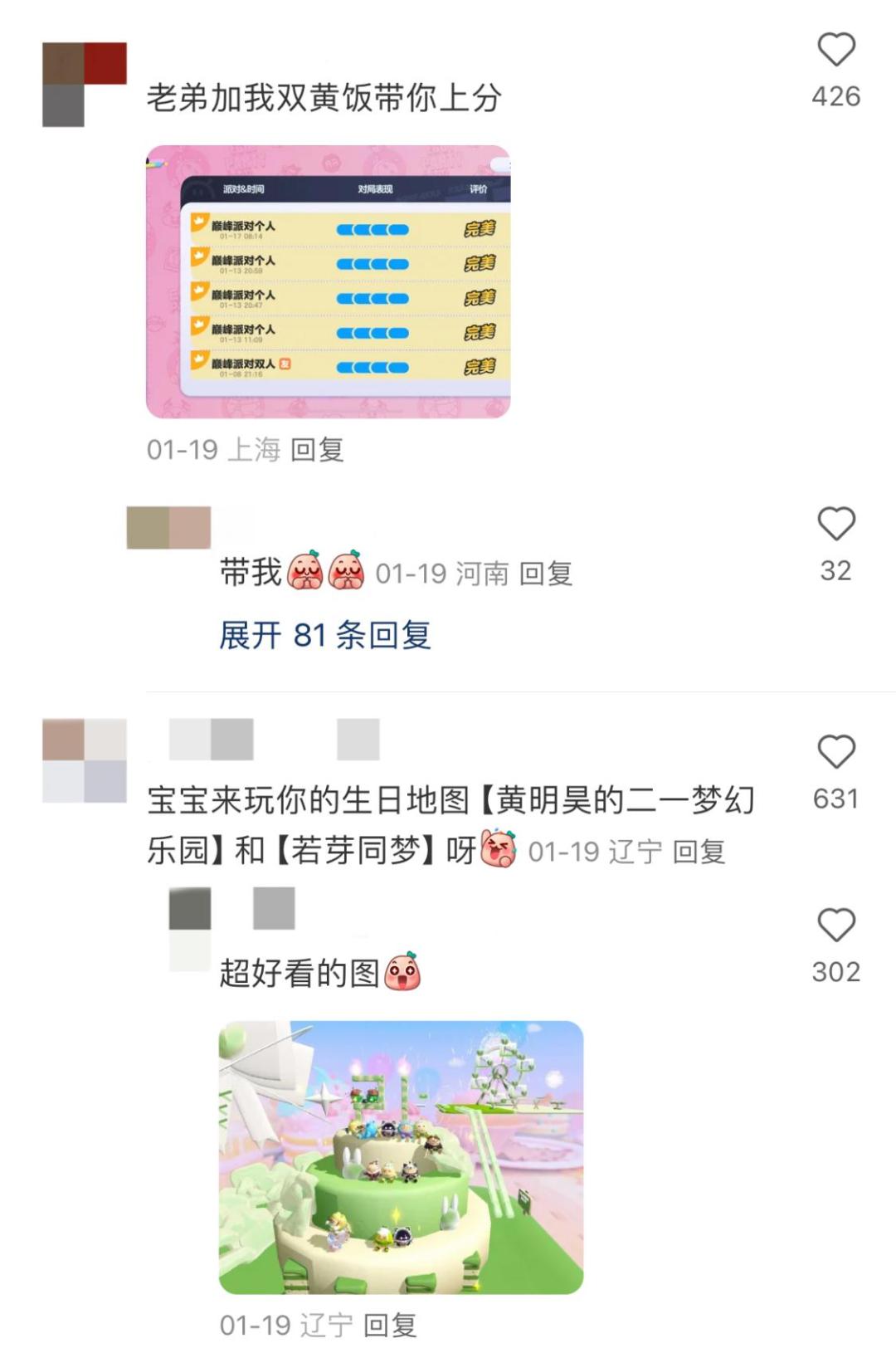在黃明昊的評論區下,他的粉絲們也紛紛曬起了戰績,想要帶他上分;也有人制作了黃明昊主題的UGC地圖並和他分享。