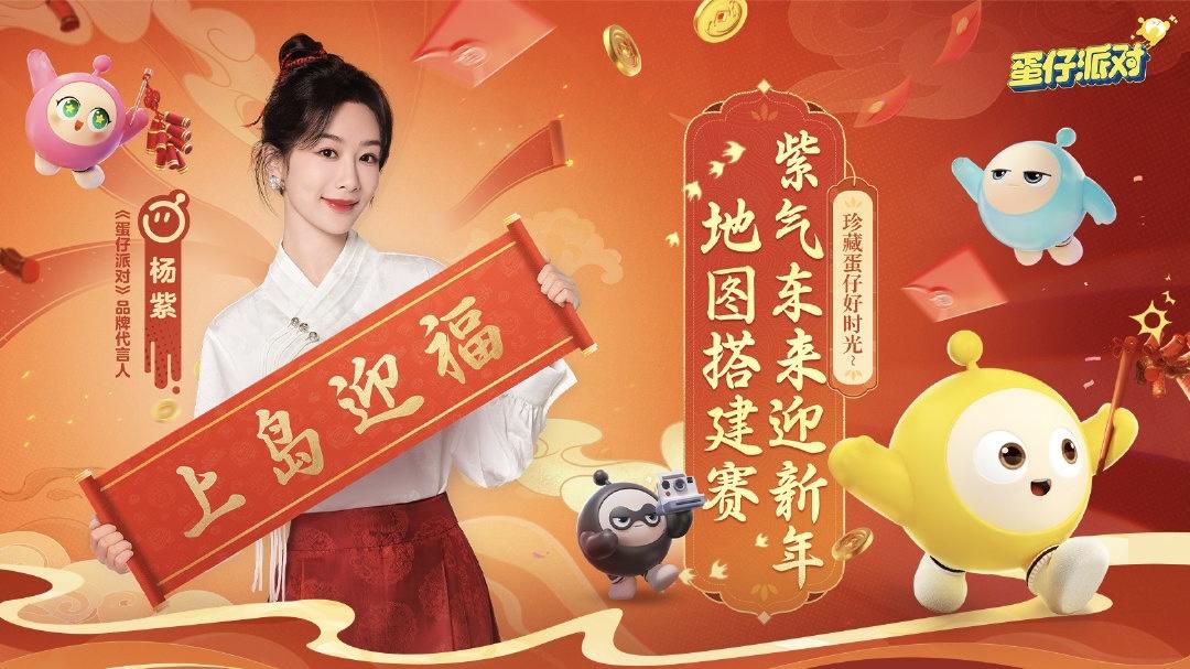 首先就是品牌代言人楊紫。《蛋仔派對》以「紫氣東來迎新年」爲主題,先是舉辦了一場地圖搭建賽,讓玩家們以家鄉新年特色爲主題搭建地圖,爲楊紫安排一場「時空之旅」。
