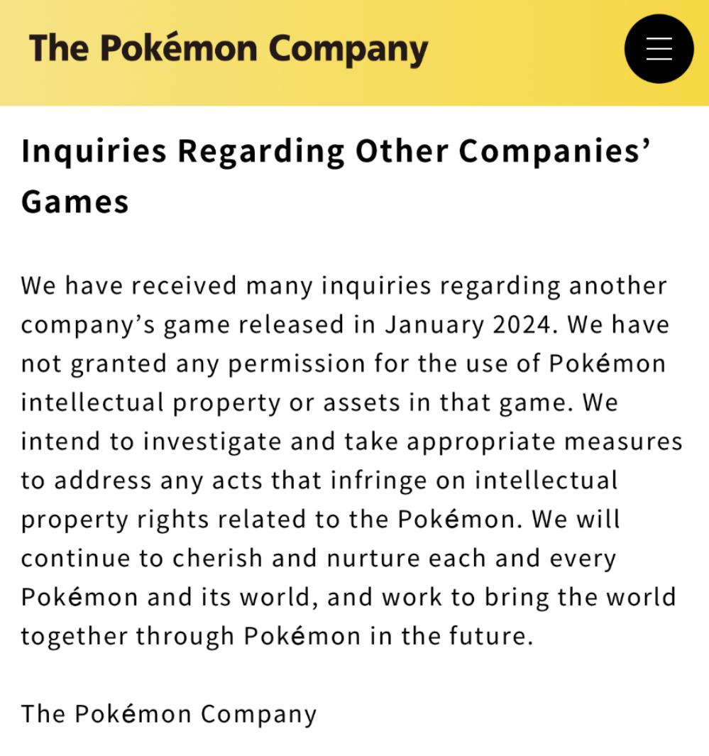 Steam目前最熱門的遊戲《幻獸帕魯》正處於抄襲寶可夢的輿論漩渦之中。對此,任天堂曾於1月25日發佈公告表示,打算調查和採取適當措施,以解決任何侵犯寶可夢相關知識產權的行爲。