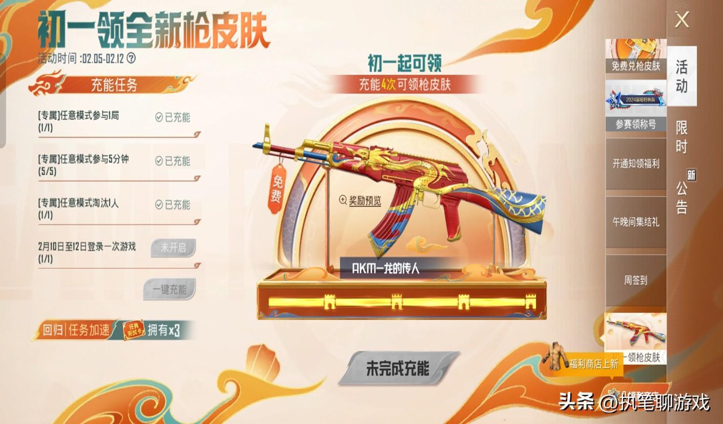 如圖所示,第一波的永久AKM已經正式登場。如果按照常理來看的話,我們需要在大年初一才能領到。但是,天哥使用的測試ID擁有“迴歸任務卡”,所以如今就直接拿到了AKM,鑲刻金龍的永久槍皮還算不錯,雖然沒有重新建模,但是已經不比普通的紫級皮膚遜色了。