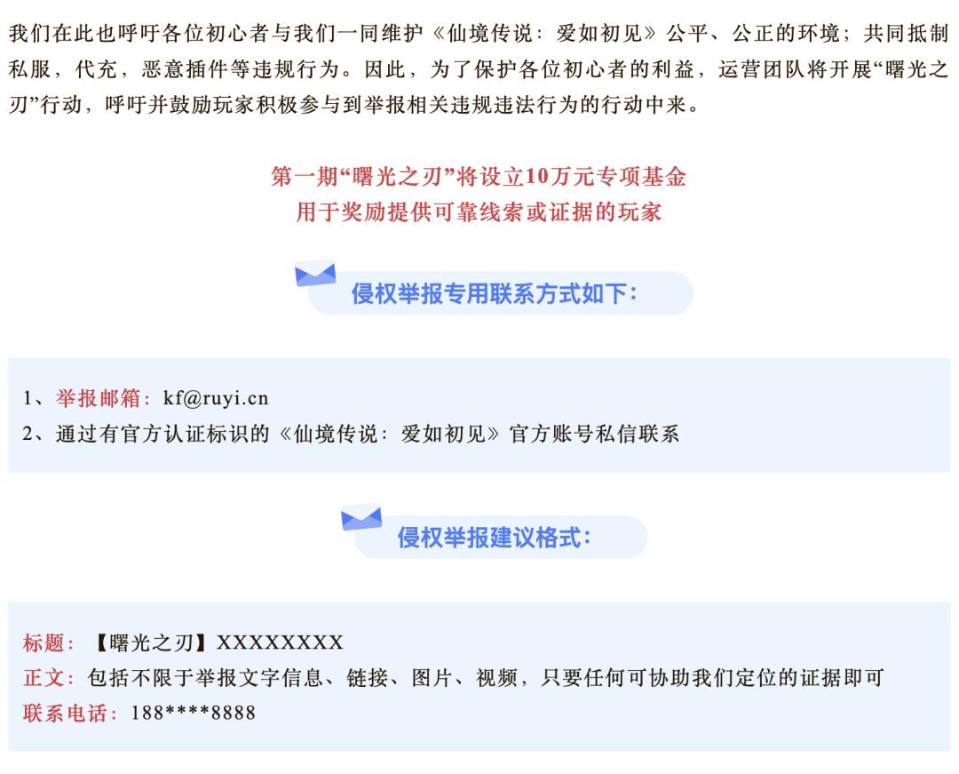 因此在兩天前,ROO手遊官方宣佈將開啓“曙光之刃”行動,用10萬元向廣大玩家懸賞ROO手遊外掛和私服的線索,與玩家們一同“抵制私服,支持正版”。