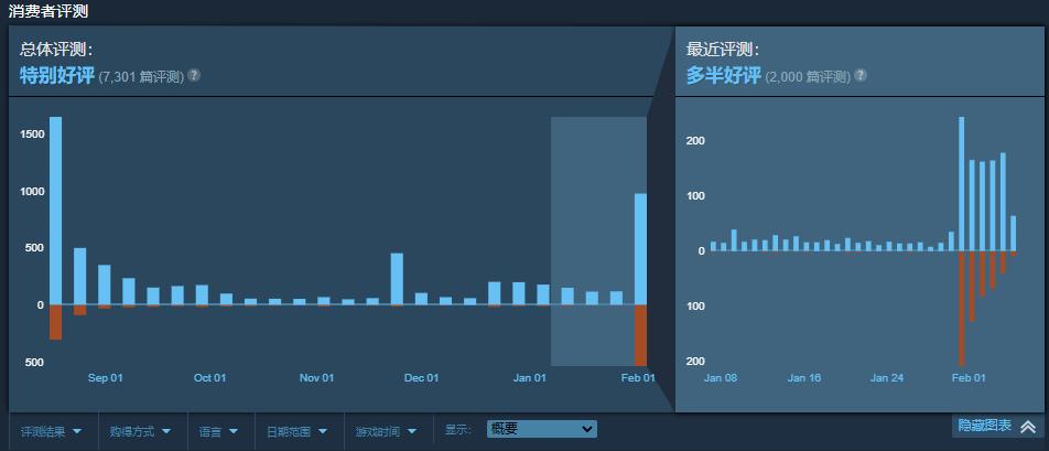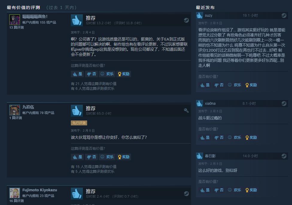 上線後,遊戲最早收穫了83%特別好評,隨着內容更新,後續遊戲好評率一路上升到了90%,在正式版上線前,其近30日的評價爲95%好評如潮。不過,在今年1月31日,遊戲的正式版發佈後,不少玩家反饋遊戲難度驟升,整體評價低於EA版本。