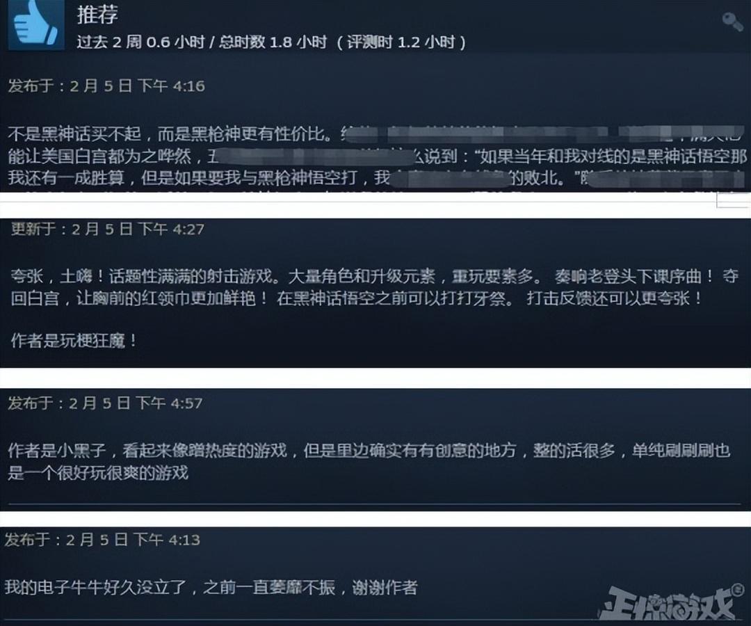 有好評玩家調侃說,不是《黑神話》買不起,而是《黑槍神》更有性價比,調侃說星測評家麥克阿瑟曾經這麼說:“如果當年和我對線的是《黑神話:悟空》那我還有一成勝算,但是如果要我與《黑槍神:悟空》對打,我會直接宣佈戰爭的敗北。”還有玩家大讚製作人是玩梗狂魔,說這是一款話題性滿滿的遊戲,遊戲量大管飽,是《黑神話》之前的開胃菜。