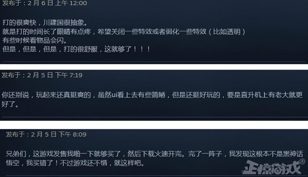 有不少玩家吐槽遊戲的不足,但是依舊給了遊戲好評,有玩家表示特效太亂了,還有物品閃爍的BUG,玩久了眼睛疼。有玩家說UI雖然簡陋,但是好玩。也有吐槽遊戲“山寨”《黑神話》蹭熱度,說遊戲一發售他就賣了,開玩後才發現這不是《黑神話》。